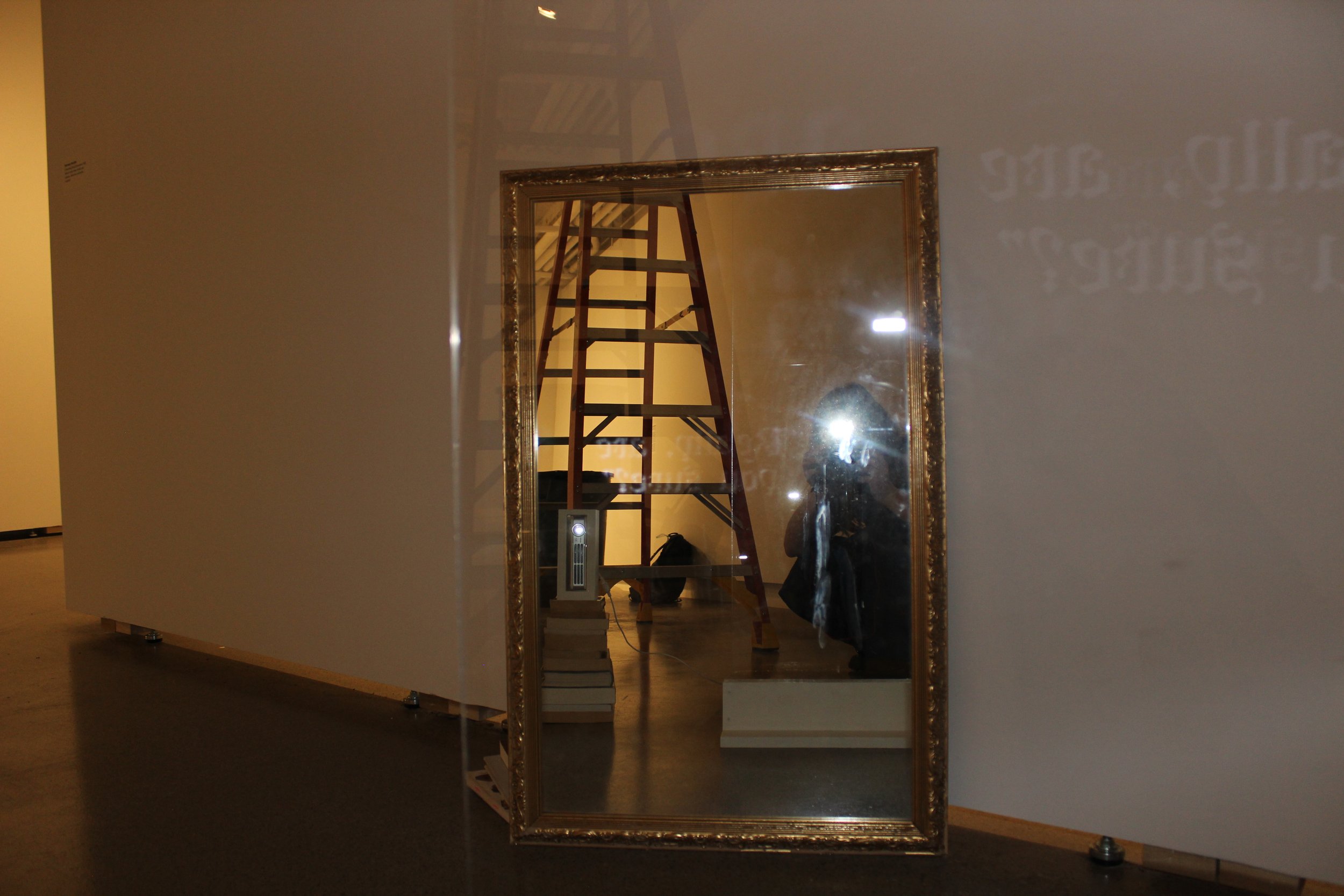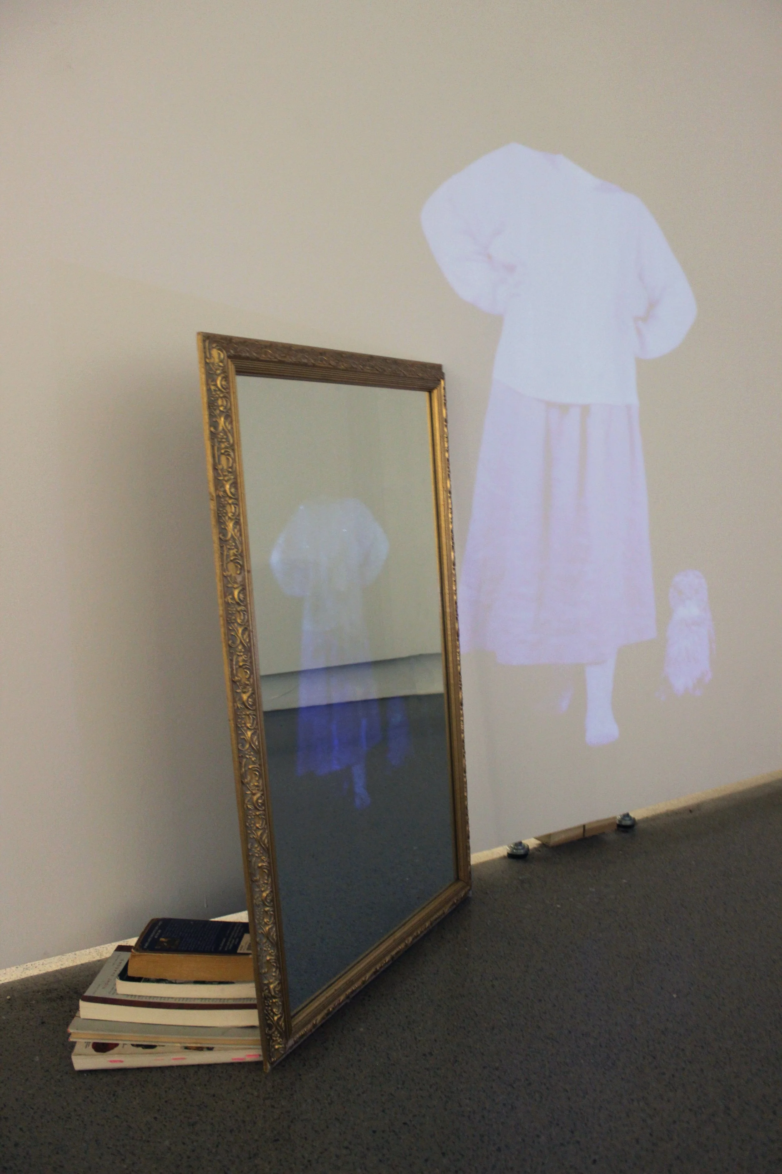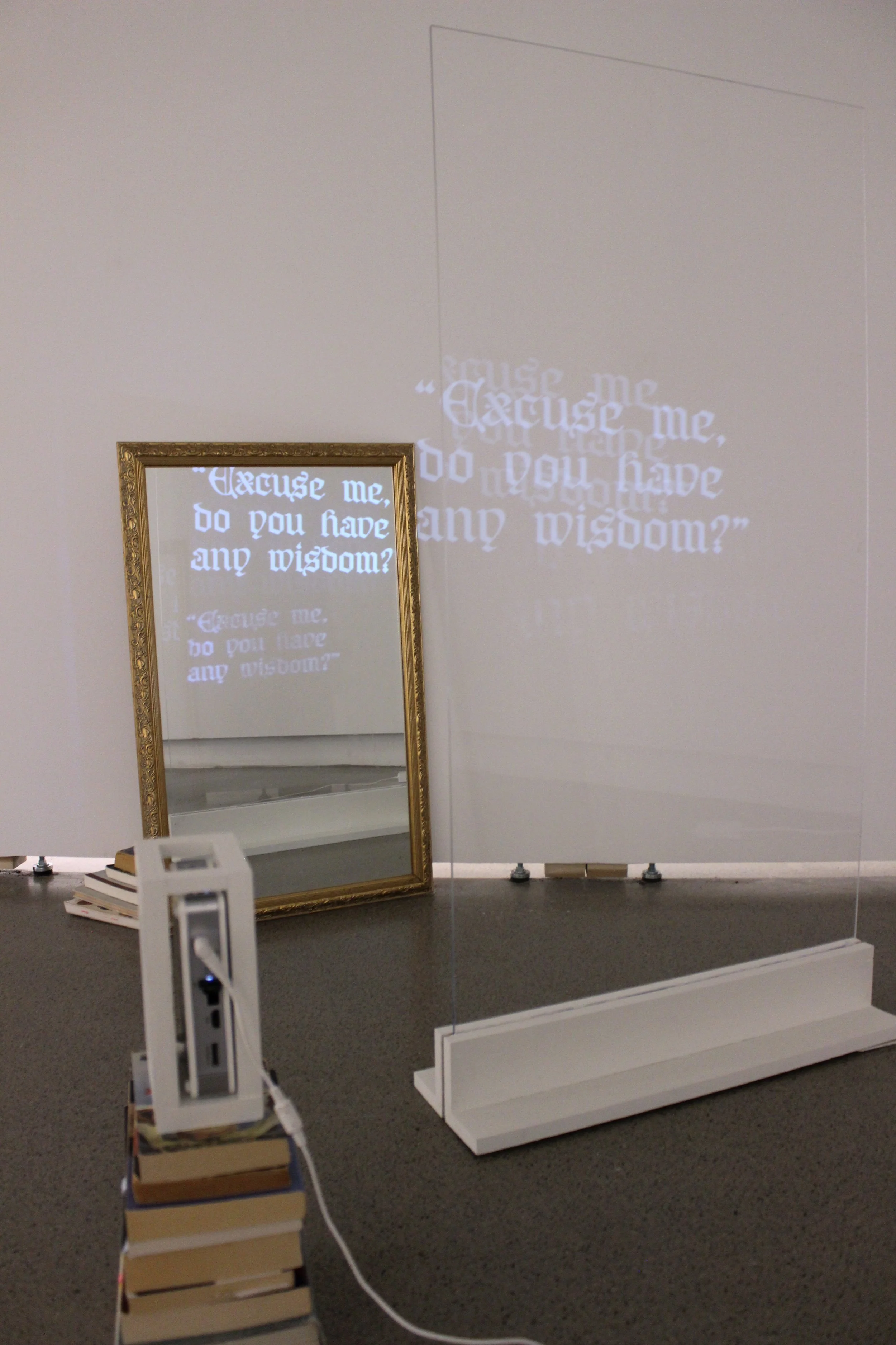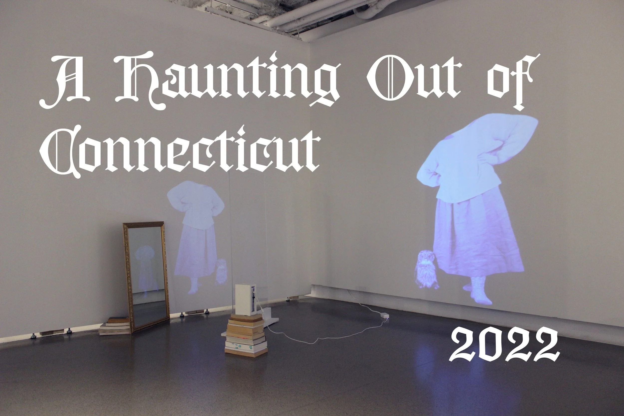Mirror, acrylic sheet, books, owl puppet, indecision, and pocket projector. A Haunting Out of Connecticut is an installation created for the March 2022 Graduate Exhibition at the School of the Art Institute of Chicago. This work is a yearning and a callback, propped against pages, pass-throughs, and reflections.